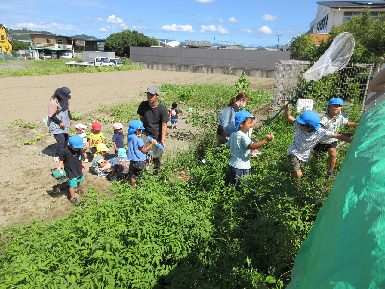 園の隣の畑で虫探しをしている様子です。バッタやコオロギなどの虫がたくさんいました。